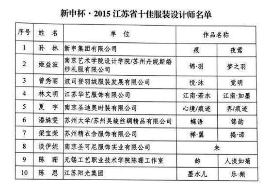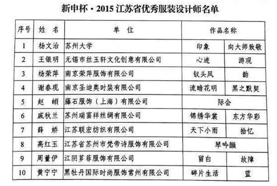 近日,江蘇省服裝協(xié)會(huì)、江蘇省服裝設(shè)計(jì)師協(xié)會(huì)代表江蘇國(guó)際服裝節(jié)組織委員會(huì)辦公室官方公布了《關(guān)于公布新申杯·2015江蘇省十佳服裝設(shè)計(jì)師評(píng)選結(jié)果的通知》。在通知中全面總結(jié)了新申杯·2015江蘇省十佳服裝設(shè)計(jì)師評(píng)比活動(dòng),并發(fā)布了“新申杯·2015江蘇省十佳服裝設(shè)計(jì)師名單”和“新申杯·2015江蘇省優(yōu)秀服裝設(shè)計(jì)師名單”?! ?/p>