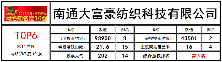 網(wǎng)絡(luò)知名度TOP6:南通大富豪紡織科技有限公司