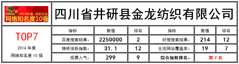 網(wǎng)絡(luò)知名度TOP7:四川省井研縣金龍紡織有限公司