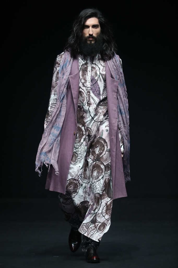 曾被VOGUE時(shí)尚網(wǎng)盛贊為:對(duì)亞麻的探索幾近偏執(zhí)的孫林,本場(chǎng)發(fā)布秀再度將其對(duì)于亞麻的執(zhí)著展露無(wú)遺。一片漆黑而空曠的秀場(chǎng),充滿憂郁而神秘的聲音中一位年輕的筑夢(mèng)者,伴隨著亞麻衣物的起舞開場(chǎng)。依次以藍(lán)色的灰、深邃的黑、純亞麻色以及主題印花四大主色系層層遞進(jìn),引發(fā)現(xiàn)場(chǎng)觀眾感官上的共鳴。從充滿原始、粗糙森林氣息的藍(lán)灰,到深邃的黑,再到純亞麻色、主題印花以及頻繁的大塊亞麻面料的拼接逐漸讓城市氣息的現(xiàn)代感漸漸浮出水面。