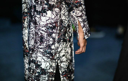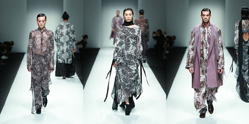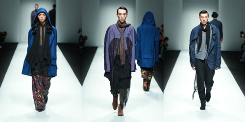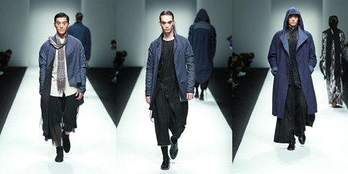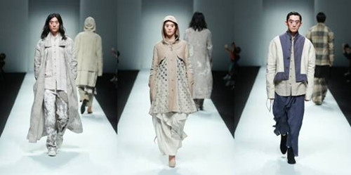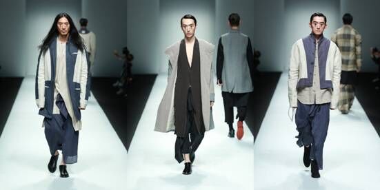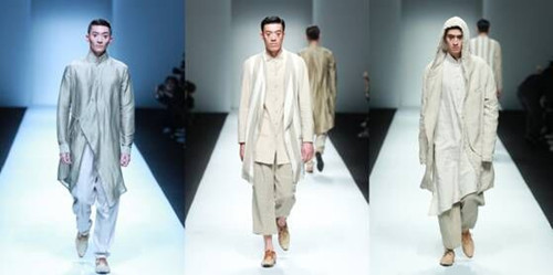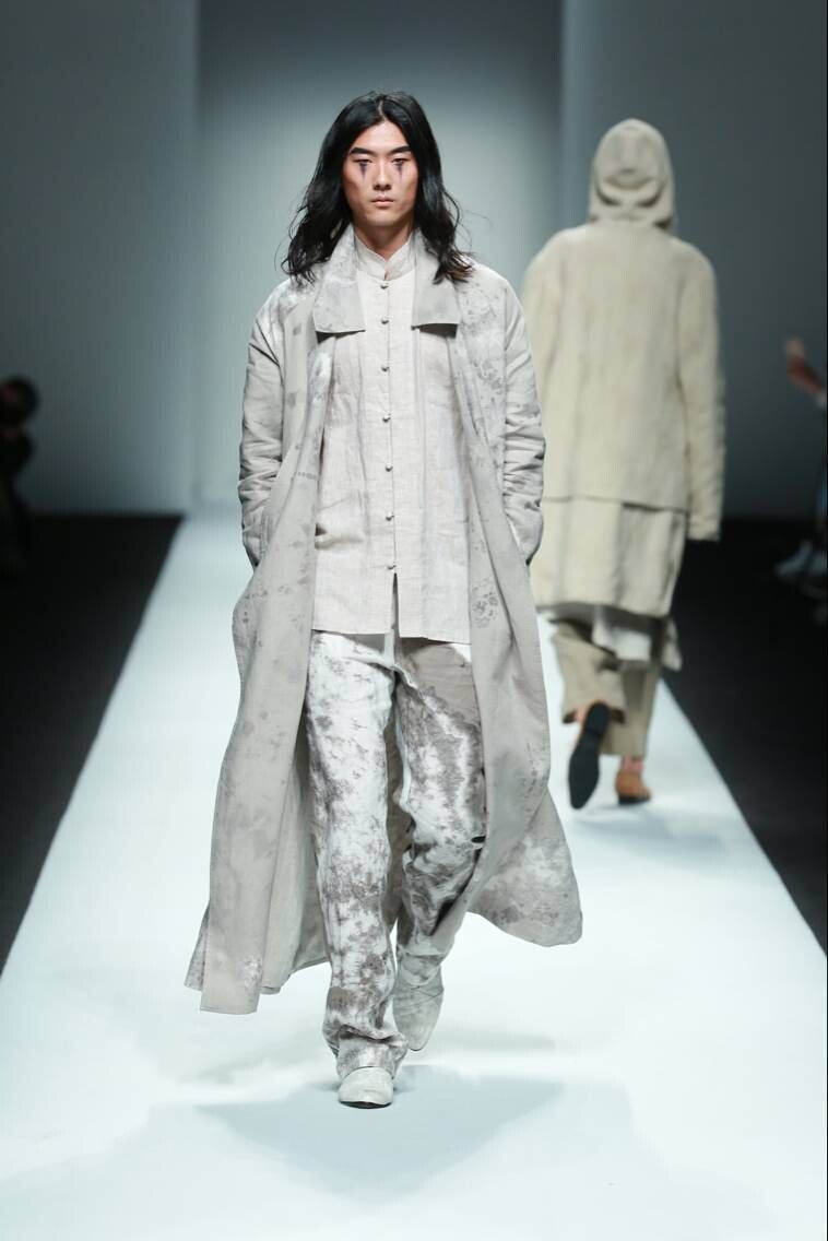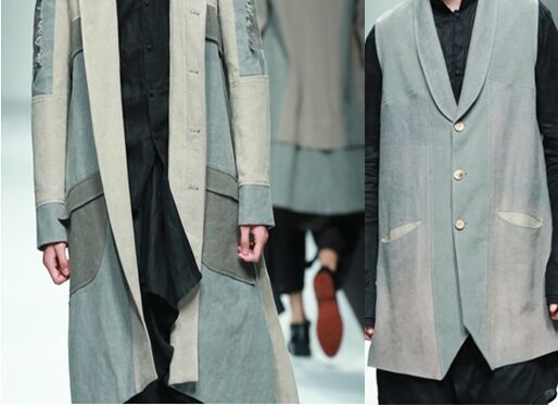 結(jié)合季節(jié)特點將亞麻纖維融合當下消費者的生活方式進行混紡比如:亞麻和絲、棉、毛等材料。在色彩上將亞麻采用天然染色并將其和扎染、吊染等進行綜合嘗試運用,整場發(fā)布會從色彩上分為四大色系:藍色的灰,深邃的黑,亞麻色和主題印花逐一呈現(xiàn),