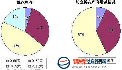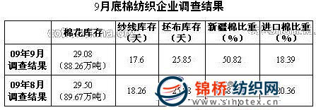 注:工業(yè)庫存調查結果僅包括棉紡織企業(yè)已經入庫棉花庫存。 1.棉紡織企業(yè)棉花庫存情況:處于新舊棉交替階段,紡織企業(yè)購棉本就“小氣”,期間天氣影響棉花生長和采摘,更給不少企業(yè)來個措手不及,爭相競拍國儲棉。多數被調查企業(yè)對本年度棉花產量尤其是質量滿意度不高,目前正密切關注新棉上市情況。被調查企業(yè)中,57%減少棉花庫存,36%增加棉花庫存;平均棉花庫存由8月底的29.50天減少至9月底的29.08天,折合棉花工業(yè)庫存量由89.67萬噸減少至88.26萬噸。 對于新年度棉花價格走勢,多數認為,從2009年棉花產量、尤其是新棉質量看,加之政府力保新疆影響,棉價不會低。