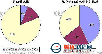3.棉紡織企業(yè)進口棉占總用棉比重:配額基本上已經彈盡糧絕,目前企業(yè)在使用的進口棉多是拍到的國儲棉,數量有限。調查結果顯示,被調查企業(yè)中,36%減少進口棉用量,21%增加進口棉用量。紡織企業(yè)進口棉比重18.39%,較上月減少1.97個百分點。