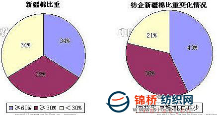4.棉紡織企業(yè)新疆棉占總用棉比重:隨著紡織市場走暖,部分企業(yè)高支紗訂單有回升跡象,增加新疆棉采購量。調查結果顯示,被調查企業(yè)中,36%增加新疆棉使用量,21%減少新疆棉使用量。紡織企業(yè)新疆棉占總用棉比重由8月底的48.43%增加至9月底的50.82%。