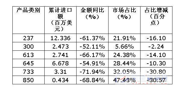 總體來看,我國紡織品服裝占美進(jìn)口市場份額比上年同期有所提升,但部分產(chǎn)品進(jìn)口額及所占市場份額同比下降。其中237類(棉制或人纖游戲裝)、300類(棉制普梳棉紗)、613類(人纖平紋布)、645類(人纖男毛衫)、733類(絲織男西裝式外套)、850類(絲綢及植物纖維制裙子)等六類產(chǎn)品進(jìn)口額同比下降50%以上,其中5類產(chǎn)品市場份額下降幅度超過10個(gè)百分點(diǎn)。