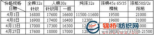 二、純滌紗的行情在4月的表現(xiàn)是較為動蕩活躍,報價幾乎是頻繁上升,也令市場人士感到措手不及,尤是月初清明幾天粗支紗上升明顯,主要是原料滌綸短纖價格的大幅彪升,江浙1.4D*38mm主流成交價由月初的7800—7900元/噸直線上漲至4月8日的8700元/噸左右,而使滌紗也相應(yīng)”水漲船高”,32S滌紗由月初的主流11500—11600元/噸左右,直線上漲至10日左右的12500元/噸左右,福建地區(qū)更高,在12700—13000元/噸左右,累計漲幅在1000元/噸以上,細(xì)支紗量價略遲緩,50S一般由月初的13400元/噸左右提升至10日左右的14000元/噸左右,漲幅多不大。而月中因原料的走疲而滌紗市場氣氛相對漸平靜乏力,出貨量下滑,部分廠家價格也是相應(yīng)有下落(主要是福建地區(qū)降價明顯)。但至下旬,受上游原料滌綸短纖價格的再度回升影響(滌綸短纖漲至9000元//噸左右),使紡紗廠家報價也仍有局部提升,如32s大廠江浙主流價在12800—13000元/噸,50s滌紗在14200元/噸左右,福建地區(qū)32S滌紗主流13200—13300元/噸左右,但是市場銷售卻是顯得較為不足,相比上半月是明顯降溫不少。后市預(yù)測:應(yīng)該說,滌綸短纖仍將是近期影響滌紗行情的主導(dǎo)因素,從近日滌短情況看,雖然相對受聚酯原料成本影響,氣氛仍會尚好,但預(yù)計暫會謹(jǐn)慎些,不過大盤仍將以穩(wěn)中振蕩態(tài)勢為主,對此,滌紗市場行情也將以穩(wěn)中適度浮動出現(xiàn),而總的來說5月氣氛可能相對有些不如4月。