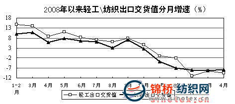 輕紡產(chǎn)品出口降幅擴大趨勢減緩。1-4月,紡織行業(yè)出口交貨值同比下降8.4%,下降幅度小于整體工業(yè)出口降幅7.4個百分點。從月度出口交貨值增速變動情況看,3、4兩個月輕紡產(chǎn)品出口降速擴大的趨勢已初步得到遏制。