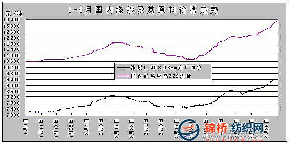 在經(jīng)歷40多天的靜如止水的行情之后,四月中下旬粘膠短纖價格開始迅速發(fā)力直線上漲,短短十天價格上漲近1400元/噸,而且這種漲勢還在持續(xù)。月末短纖價格已升至13000元/噸左右,而30S人棉紗也漲至18000元/噸。月末不少粘膠短纖廠家甚至供不應(yīng)求,有的甚至故意囤貨待漲,下游人棉紗及人棉布雖有跟漲,但幅度尤其是人棉坯布的遠遠小于短纖,這也造成下游廠家開始出現(xiàn)虧損,經(jīng)營利潤不但壓縮,但目前這種漲勢應(yīng)該還會持續(xù)一段時間。