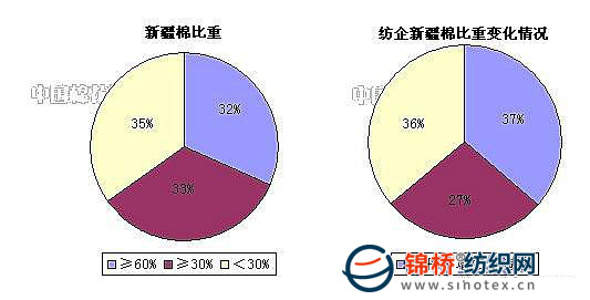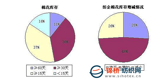 注:工業(yè)庫存調(diào)查結(jié)果僅包括棉紡織企業(yè)已經(jīng)入庫棉花庫存。 1.棉紡織企業(yè)棉花庫存情況:流通市場(chǎng)棉花資源緊缺,加之本年度棉花進(jìn)口配額發(fā)放數(shù)量少,網(wǎng)上競(jìng)拍國家儲(chǔ)備棉成為多數(shù)被調(diào)查紡織企業(yè)原料采購的主要來源。部分企業(yè)出于對(duì)棉花資源緊張等方面考慮,增加棉花拍儲(chǔ)量,棉花庫存水平有所增加。此外不同規(guī)模、不同地區(qū)的企業(yè)根據(jù)自身情況調(diào)整產(chǎn)品結(jié)構(gòu),配棉比及棉花用量有增有減,其中多數(shù)被調(diào)查企業(yè)出于企業(yè)減產(chǎn)、化纖用量增加等原因,棉花單月耗用量出現(xiàn)下降。被調(diào)查企業(yè)中,26%減少棉花庫存,48%增加棉花庫存;平均棉花庫存由6月底的31.95天增加至7月底的33.09天,折合棉花工業(yè)庫存量由99.65萬噸增加至101.14萬噸。 對(duì)于新舊棉交替期間棉價(jià)走勢(shì),從種植面積、目前天氣狀況等方面考慮,多表示不會(huì)有大的下滑;也有企業(yè)認(rèn)為隨著新棉上市,市場(chǎng)資源階段性供應(yīng)充裕,棉價(jià)有下跌。