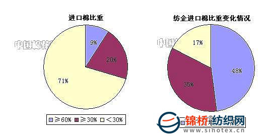 3.棉紡織企業(yè)進(jìn)口棉占總用棉比重:雖然本年度棉花進(jìn)口配額下發(fā)數(shù)量少,不少企業(yè)配額已經(jīng)彈盡糧絕,但是03/04年度國家儲(chǔ)備棉拋售為急需進(jìn)口棉的企業(yè)解決燃眉之急,部分企業(yè)抓住機(jī)會(huì)拍下不少外棉,紡織企業(yè)進(jìn)口棉總體占用量有很大提高。調(diào)查結(jié)果顯示,被調(diào)查企業(yè)中,17%減少進(jìn)口棉用量,35%增加進(jìn)口棉用量。紡織企業(yè)進(jìn)口棉比重22.86%,較上月增加5.9個(gè)百分點(diǎn)。