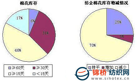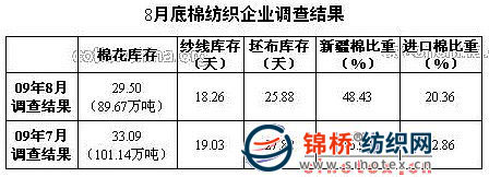 注:工業(yè)庫存調查結果僅包括棉紡織企業(yè)已入庫棉花庫存。 1.棉紡織企業(yè)棉花庫存:8月中下旬部分地區(qū)已經有棉花零星采摘,據多數(shù)被調查企業(yè)反映,9月底10月初基本能夠用上新棉,因此目前采購棉花比較“小氣”,現(xiàn)有棉花庫存能夠滿足從目前至新棉集中上市中間時段用棉即可,普遍庫存量不大,而且已經有企業(yè)開始籌錢準備新年度棉花采購工作。 從單月用棉看,由于不少企業(yè)限產,每月消耗棉花數(shù)量下降。此外加之市場上棉花不多,采購困難,不少企業(yè)增加化纖用量,一方面能緩解購棉壓力,另一方面滌棉產品銷售也還不錯,導致配棉比總體下滑。被調查企業(yè)中,70%減少棉花庫存,5%增加棉花庫存;平均棉花庫存由7月底的33.09天減少至8月底的29.50天,折合棉花工業(yè)庫存量由101.14萬噸減少至89.67萬噸。 對于新舊棉交替期間棉價,多數(shù)被調查企業(yè)認為目前屬于零星上市,價格會有些高,而后在新棉集中大量上市的一段時間內價格可能會出現(xiàn)一定下滑,但是從總體看,新年度棉價高于2008/09年度。