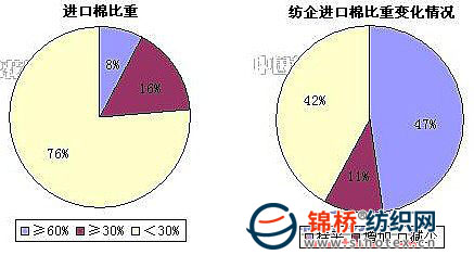 3.棉紡織企業(yè)進口棉占總用棉比重:配額很少,加之國儲棉拋售的進口棉數(shù)量少,紡織企業(yè)進口棉有所下滑。調查結果顯示,被調查企業(yè)中,42%減少進口棉用量,11%增加進口棉用量。紡織企業(yè)進口棉比重20.36%,較上月減少2.5個百分點。