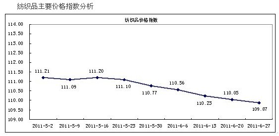 “中國·柯橋紡織指數(shù)”20110627期價(jià)格指數(shù)收盤于109.87點(diǎn),與上期相比下跌了0.16%。 本期價(jià)格指數(shù)與去年同比上調(diào)14.46%。本期從一級(jí)分類品種中顯示:原料類、坯布類、服裝面料類價(jià)格指數(shù)不等量下跌,拉動(dòng)總類價(jià)格指數(shù)小幅下滑;但家紡類、服飾輔料類價(jià)格指數(shù)不等量回升,相對(duì)制約了總類價(jià)格指數(shù)的下跌幅度。 本周價(jià)格指數(shù)運(yùn)行情況分析 油價(jià)續(xù)跌聚酯切片價(jià)格走軟,棉花價(jià)格小幅下滑。6月17日紐約商品交易所輕質(zhì)原油7月期貨收?qǐng)?bào)93.01美元/桶,至6月24日8月期貨收?qǐng)?bào)91.16美元/桶;6月17日倫敦北海布倫特原油8月期貨收于113.21美元/桶,至6月24日收?qǐng)?bào)105.12美元/桶。國際原油價(jià)格繼續(xù)下滑,上游聚酯原材料市場價(jià)格走軟,例如PTA華東市場現(xiàn)貨較低商談價(jià)6月17日在9450元/噸,至6月24日在9200元/噸;MEG華東市場現(xiàn)貨較低商談價(jià)6月17日在9470元/噸,至6月24日在9450元/噸。江浙半光切片現(xiàn)貨現(xiàn)款承兌較低商談價(jià)6月17日在11975元/噸,6月24日在11850元/噸,價(jià)格呈現(xiàn)小幅下滑走勢。國內(nèi)棉花價(jià)格下跌,例如國內(nèi)328級(jí)棉6月17日收?qǐng)?bào)24508元/噸,至6月24日收?qǐng)?bào)24421元/噸,下跌87元/噸;229級(jí)棉6月17日收?qǐng)?bào)26541元/噸,至6月24日收?qǐng)?bào)26436元/噸,下跌105元/噸。 外單轉(zhuǎn)移國際環(huán)境不容樂觀,浙江電力供需基本平衡。國際經(jīng)濟(jì)環(huán)境不容樂觀。從國際環(huán)境看,美國和日本經(jīng)濟(jì)疲弱不堪,難以提振人們信心,歐債危機(jī)隨時(shí)可能成為全球新一輪金融風(fēng)險(xiǎn)的引爆點(diǎn),人們對(duì)全球經(jīng)濟(jì)二次探底的擔(dān)憂并末消除。歐洲債務(wù)危機(jī)對(duì)美國的潛在影響可能達(dá)到次貸危機(jī)的水平。生產(chǎn)成本、人力成本的增加和人民幣升值壓力更是讓紡織服裝訂單流失,一些訂單向越南、孟加拉、印尼等東南亞國家轉(zhuǎn)移。國內(nèi)銀根緊縮,中小紡企融資難度加大。中國紡織工業(yè)協(xié)會(huì)孫瑞哲副會(huì)長在2011年6月22日全球紡織經(jīng)濟(jì)高峰論壇發(fā)言公開表示,紡織品出口退稅近期不會(huì)下調(diào)。最近浙江電力供需基本平衡。目前浙江省有序用電工作協(xié)調(diào)小組決定取消全省有序用電方案,隨著省內(nèi)機(jī)組檢修結(jié)束陸續(xù)并網(wǎng)發(fā)電,全省統(tǒng)調(diào)供電能力已達(dá)3880萬千瓦。近期全省普降大到暴雨,非統(tǒng)調(diào)水電大發(fā),加上天氣涼爽,統(tǒng)調(diào)用電需求有所回落,電力供需基本平衡。短期內(nèi)全省電力供需基本平衡。電力部門表示,將根據(jù)實(shí)際用電情況,及時(shí)調(diào)整有序用電方案。 服裝面料價(jià)格指數(shù)小幅下跌,夏季大眾面料成交下滑。近期,輕紡城市場營銷滯暢互現(xiàn),服裝面料價(jià)格指數(shù)小幅下跌,大眾面料成交回縮,但創(chuàng)意面料依然夏秋品種互動(dòng)。服裝面料中的純棉面料、滌棉面料、滌粘面料、滌錦面料、粘膠面料、粘毛面料、錦綸面料、錦棉面料成交量價(jià)呈現(xiàn)不等量下滑走勢,拉動(dòng)服裝面料價(jià)格指數(shù)小幅下滑。夏裝大眾面料現(xiàn)貨成交繼續(xù)回縮,創(chuàng)意花型面料營銷優(yōu)勢仍存,滌綸FDY噴織印花雪紡、118DFDY針織印花兩面彈T恤布和人棉布大眾花型現(xiàn)貨成交局部繼續(xù)回縮,部分中小經(jīng)營戶現(xiàn)貨成交仍顯不足,但一些前店后廠式布業(yè)公司和規(guī)模性經(jīng)營門市創(chuàng)意花型面料依然夏秋品種互動(dòng),秋裝面料局部下單有增。 下周價(jià)格指數(shù)展望 預(yù)計(jì)后市傳統(tǒng)交易區(qū)和公司化交易區(qū)面料成交仍將夏秋品種互動(dòng),預(yù)計(jì)后市夏秋創(chuàng)意面料營銷仍將局部走暢。因外需不足,內(nèi)需提振乏力,夏日常規(guī)淡季已為期不遠(yuǎn),后市服裝面料和家紡面料部分中小經(jīng)營戶大眾現(xiàn)貨成交仍顯疲乏,價(jià)格指數(shù)明顯攀升仍顯乏力。 本期襯料類、床上用品類、線繩類、日用家紡類、滌綸面料類價(jià)格指數(shù)漲幅位于前五位,銷量比上期不等量增加,部分代表品單價(jià)不等量上揚(yáng)是主要因素。 本期錦棉面料類、粘膠類、純棉面料類、粘毛面料類、花邊類價(jià)格指數(shù)跌幅位于前五位,成交量比上期不等量下滑,部分代表品單價(jià)不等量下滑是主要因素。