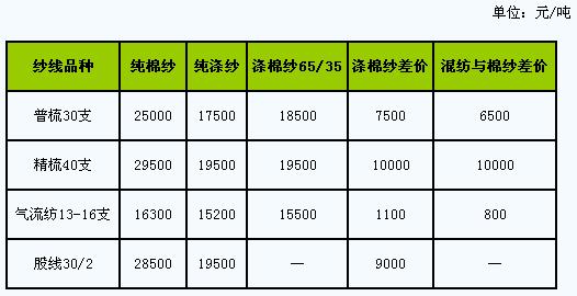 山東濱州某紡企負(fù)責(zé)人表示,現(xiàn)在其企業(yè)生產(chǎn)7-32支全棉紗,一年生產(chǎn)紗線4000多噸,但多數(shù)紗線虧損100-200元/噸,已經(jīng)不指望棉紗創(chuàng)收。他們在東營還有一個混紡工廠,這家廠子以生產(chǎn)純滌紗、滌棉紗為主,因?yàn)槌杀据^低,純利潤在500-700元/噸,東營規(guī)模雖小,卻成了企業(yè)贏利的主力!目前國內(nèi)混紡紗的主要原料滌綸的價(jià)格僅為棉花價(jià)格的一半,巨大的價(jià)格差(詳見下表)導(dǎo)致純棉紗市場迅速流失,混紡紗的天下越來越廣大。