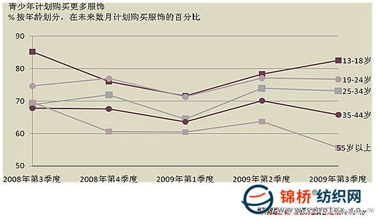 生活方式調(diào)查的數(shù)據(jù)表明經(jīng)濟(jì)趨勢已經(jīng)影響青少年購買服飾,并使他們略微減少服飾消費(fèi)量。盡管青少年仍在購買服飾,他們比以前更關(guān)心價格,也開始精打細(xì)算尋找銷售價格偏低的零售渠道。青少年在專賣店購買服飾的百分比從2008年第一季度的35%下降至2009年第三季度的24%。而在平價商店購買的百分比反而從18%上升至23%。更多青少年也等待在季末減價時購買服飾,百分比從45%增加至50%。青少年人均服飾消費(fèi)從2008年第三季度的98美元降低至2009年第一季度的68美元。然而,單從2009年來看,青少年人均消費(fèi)的總體趨勢不斷走高,在2009年第三季度人均消費(fèi)達(dá)到83美元,這表明青少年服飾消費(fèi)將會繼續(xù)增長。