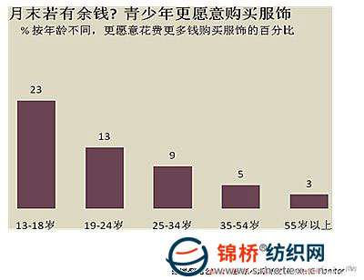 復(fù)蘇跡象 為什么青少年消費(fèi)開始復(fù)蘇而總體服飾消費(fèi)仍表現(xiàn)平平?生活方式調(diào)查的數(shù)據(jù)表明,青少年的個(gè)人財(cái)務(wù)狀況幾乎對(duì)他們的服飾購(gòu)買計(jì)劃不構(gòu)成影響,而成年消費(fèi)者的服飾購(gòu)買計(jì)劃依賴他們的收支狀況。2009年消費(fèi)表現(xiàn)好壞參半,青少年增加了服飾消費(fèi),而總體消費(fèi)未見(jiàn)起色。因?yàn)楹统赡耆讼啾?,青少年?cái)務(wù)負(fù)擔(dān)較少,他們有更多的可支配收入可花費(fèi)在服飾購(gòu)買上。當(dāng)青少年被問(wèn)及如果月末有多余的錢會(huì)如何打算時(shí),雖然選擇儲(chǔ)蓄的百分比最高,為27%,然而青少年比其它年齡層的消費(fèi)者更愿意花費(fèi)在服飾上,百分比分別是23%和6%。青少年也比其它年齡層更樂(lè)于花費(fèi)在娛樂(lè)上,百分比分別是17%和7%,花費(fèi)在餐飲上的意愿較低,百分比分別是5%和13%,或者用于還債,百分比分別是7%和31%。 青少年和牛仔 2009年,青少年愿意花費(fèi)可支配收入購(gòu)買牛仔褲。青少年擁有牛仔褲的數(shù)量比美國(guó)人均擁有牛仔褲的數(shù)量要高。牛仔褲是最受歡迎的校園服飾之一。2009年第三季度,牛仔褲占了青少年服飾購(gòu)買的15%,這比起2008年第三季度的12%增加了。在青少年打算購(gòu)買下一條牛仔褲時(shí),剪裁合身和款式時(shí)尚是最主要的購(gòu)買驅(qū)動(dòng)因素。今年,青少年正在尋找寬松式牛仔褲(28%),鉛筆褲(24%),靴褲(17%)。青少年有可能在2009年第四季度進(jìn)一步增加對(duì)牛仔褲的需求。青少年打算在未來(lái)數(shù)月購(gòu)買若干條牛仔褲的百分比在2009年第一季度觸底至31%,在第三季度反彈升至46%。相比之下,成年消費(fèi)者打算購(gòu)買若干條牛仔褲的百分比在同期還略微下降,從24%減少到23%。