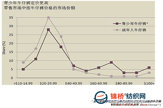 盡管價格在20至30美元的牛仔褲在市場上占到最大份額,根據(jù)美國棉花公司零售調(diào)查(Retail Monitor™)的數(shù)據(jù),青少年零售市場的牛仔褲價格比成年人的平均零售價格要高。青少年牛仔市場的高端產(chǎn)品中,價格從70至100美元以上的牛仔褲占青少年牛仔褲零售市場的21%。這個百分比顯然比成年人市場中精品牛仔褲的百分比6%要高出很多。青少年服飾零售商意識到青少年比成年消費者更愿意花費在服飾上,因此零售商期望通過牛仔產(chǎn)品把青少年重新吸引到商店中。為獲得更高的營業(yè)額,他們著重打造牛仔褲的款式,水洗效果,提供更多面料選擇,同時也提供更廣闊的價格空間供消費能力不同的青少年選擇。