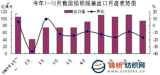 據(jù)海關(guān)統(tǒng)計,2009年1-10月我國出口紡織服裝(包括服裝及衣著附件、紡織紗線織物及制品)1362.4億美元,比2008年同期(下同)下降11.6%。其中出口服裝及衣著附件879億美元,下降10.9%;出口紡織紗線、織物及制品483.4億美元,下降12.9%。其出口主要特點如下: