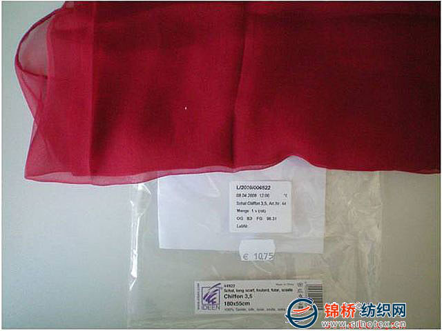 2009年7月24日,歐盟委員會(huì)非食品類快速預(yù)警系統(tǒng)(RAPEX)對(duì)產(chǎn)自中國(guó)的“IDEEN”牌圍巾發(fā)出消費(fèi)者警告。本案通報(bào)國(guó)是德國(guó)。此次通報(bào)涉及的圍巾是紅色薄軟綢材料,條形碼編碼是4005524449225。 |
