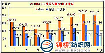 據(jù)海關(guān)總署最新發(fā)布進(jìn)出口數(shù)據(jù)顯示,2010年8月我國紡織服裝出口201.42億美元,同比增長28.3%,環(huán)比下降3.3%。其中服裝出口134.64億美元,同比增長27.8%,環(huán)比微降1%;紡織品出口66.78億美元,為2010年5月來最低水平,同比增長29.4%,環(huán)比下降7.1%。 2010年1-8月我國紡織服裝出口1298.04億美元,同比增長23.8%,同比2008年增長9.1%。其中服裝出口802.89億美元,同比增長19%,同比2008年增長7%;紡織品出口495.15億美元,同比增長32.3%,同比2008年增長12.7%。 |