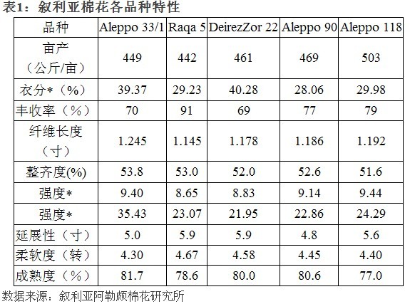 敘利亞只生產(chǎn)陸地棉。所有的棉花均采用灌溉種植,是敘利亞經(jīng)濟(jì)回報(bào)率最高的作物。最初的種植品種是敘利亞棉花局在八十年代初開發(fā)的Aleppo40,目前主要種植品種有Aleppo90、Aleppo33/1、Aleppo118、Raqa5和DeirezZor22(各品種主要特性見表1)。敘棉花局目前正在研究開發(fā)抗旱性和抗高溫更突出的棉花新品種。