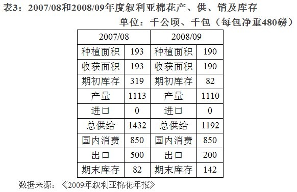敘利亞可為國(guó)內(nèi)紡紗廠提供約25萬(wàn)噸的皮棉,其中,國(guó)營(yíng)工廠使用約17萬(wàn)噸,私營(yíng)工廠使用1—2萬(wàn)噸,剩余的供出口(產(chǎn)、銷、庫(kù)存具體情況見表3)。