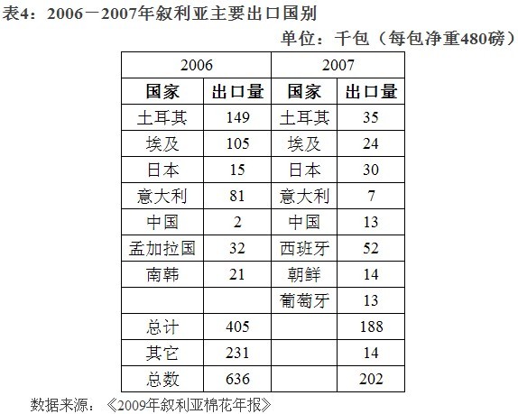 敘利亞實(shí)行禁止進(jìn)口、限制出口的棉花貿(mào)易政策。雖然有所限制,但棉花的出口額也居敘出口商品前三位,僅次于石油和羊毛出口。近年來,由于棉花產(chǎn)量下降和紡紗能力提高,棉花出口量一直在下降。敘利亞的棉花主要出口到土耳其、埃及、日本、韓國(guó)和中國(guó)(具體情況見表4)。目前由于國(guó)際棉價(jià)大漲,敘利亞棉花銷售十分活躍。敘利亞棉花的銷售季節(jié)可以達(dá)到22個(gè)月。