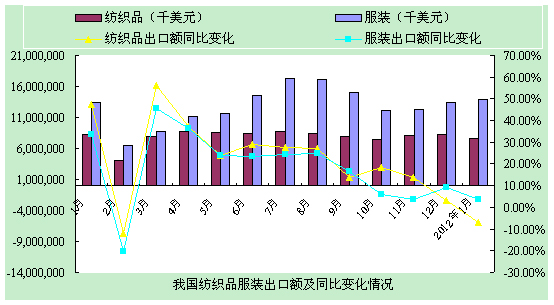 2012年1月,我國出口紡織紗線及織物76.76億美元,出口服裝及衣著附件138.42億美元,分別比12月增長了-7.5%、2.9%,紡織品及服裝出口增幅均降至個位數(shù)。1月,紡織品服裝出口215.2億美元,下降0.5%。其中紡織品出口下降6.8%,服裝出口在同比基數(shù)較高的情況下仍保持增長,增幅為3.5%。