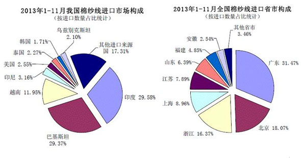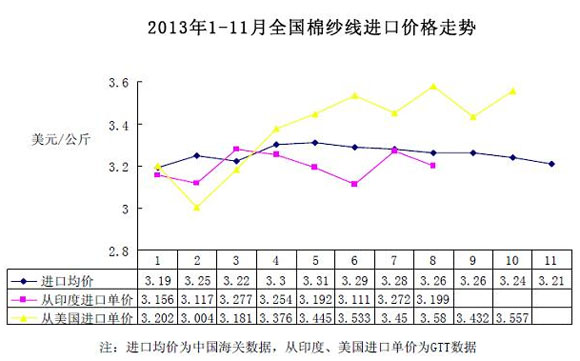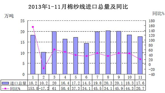 一、2013年1-11月我棉紗線進(jìn)口總體增長(zhǎng)。