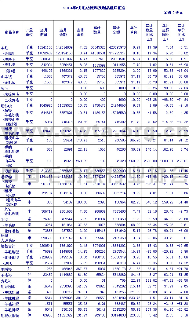 2013年2月毛紡原料及制品進(jìn)口匯總