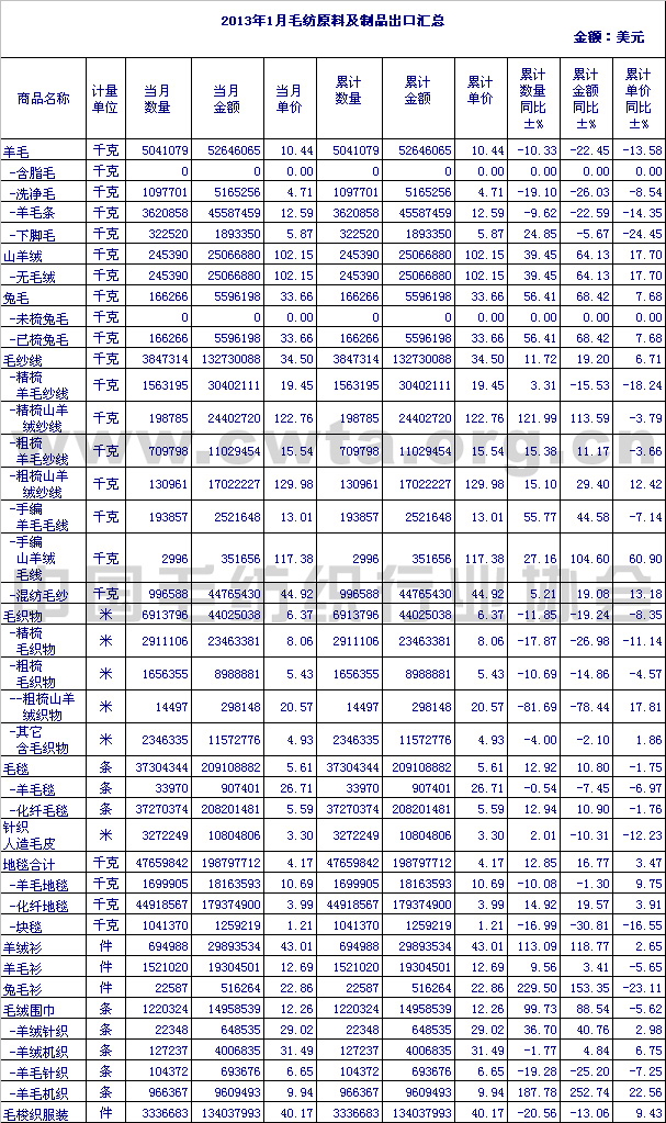 錦橋紡織網(wǎng)—資訊頻道> 外貿(mào)信息>正文 2013年1月毛紡原料及制品出口匯總