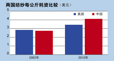 紡織業(yè)在美國的生產(chǎn)成本,已低于中國、印度、土耳其、韓國、巴西,最近已有浙江科爾集團(tuán)等一些紡企前往美國開廠。有數(shù)據(jù)顯示,2003年,在美國紡紗每公斤耗資2.86美元,在中國2.76美元。而到2010年,在美國需耗資3.45美元,在中國則已躍升至4.13美元。