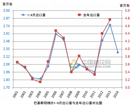 隨著棉紗月出口量持續(xù)下滑,2014年巴基斯坦棉紗出口量將難以實(shí)現(xiàn)突破。今年1-9月,巴基斯坦棉紗累計(jì)出口87萬(wàn)噸,同比減少16.9%,為三年來(lái)最低水平。照這個(gè)趨勢(shì)發(fā)展,巴基斯坦棉花消費(fèi)前景非常不妙。
