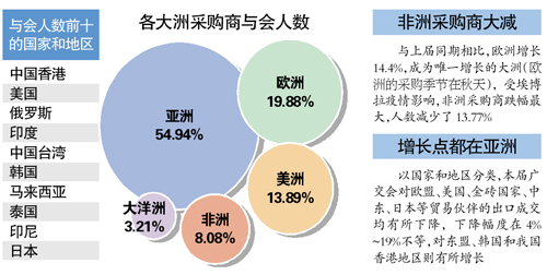 本屆廣交會(huì)采購商與會(huì)186104人,來自211個(gè)國家和地區(qū),比第115屆減少1.07%;成交總額1792.03億元人民幣,比115屆同期下降6.1%。其中,對(duì)歐盟、美國、金磚國家、中東、日本等主要貿(mào)易伙伴的出口成交均有所下降,下降幅度在4%到19%不等,僅對(duì)東盟、韓國等有所增長。