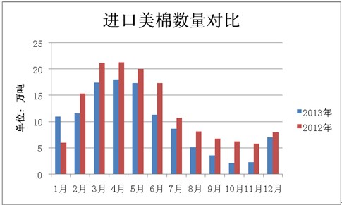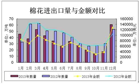 由中國紡織工業(yè)聯(lián)合會統(tǒng)計中心提供的數(shù)據(jù)顯示,2013年12月份棉花進口數(shù)量較11月份大幅增加。當(dāng)月進口原棉總量60.86萬噸,比上個月增加43.55萬噸,環(huán)比上漲251.59%;比2012年12月進口棉花數(shù)量增加7.64萬噸,同比增加14.36%。本月棉花進口數(shù)量仍以配額內(nèi)和配額外為主,滑準(zhǔn)稅進口棉花38.72萬噸,較上月大幅增加27.29萬噸。其中,配額內(nèi)進口棉花20.50萬噸,環(huán)比減少402.75%。配額內(nèi)和滑準(zhǔn)稅進口棉花總和占進口總量的97.3%。2013年全年累計進口棉花414.94萬噸,比上一年共進口減少98.78萬噸,同比下降19.23%。(見圖1)截至12月份,2013/14年度(2013年9月—2014年8月)中國進口棉花累計達112.41萬噸,和2012/13年度相比,同比減少24.67萬噸,降低17.95%?! ?/p> 圖1:棉花進出口量與金額對比 2013年12月份,由于印度新棉大量上市,印度棉進口大增,是本月最大的進口來源國,數(shù)量較上月大幅增加,進口數(shù)量由上月的0.84萬噸增加至本月的34.22萬噸。環(huán)比上漲75.4%。與12年12月份的13.37萬噸相比,同比下降155.9%。 本月,美棉進口排在第二位,因進口總量增加,本月進口美國棉花為6.97萬噸,棉花進口數(shù)量占總量的11.45%,比上個月增加4.68萬噸,環(huán)比上漲204.37%。與去年同期相比,同比下降12%。(見圖2) 澳大利亞仍本月在進口國中排第三,棉花數(shù)量比上月減少,為4.46萬噸,占總進口量的7.3%,比11月份減少3.26萬噸,環(huán)比下降42.2%。與去年同期相比,減少7.14萬噸,同比下降61.6%。