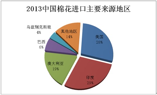 圖2:進口美棉數(shù)量對比 12月,中國從巴西進口棉花數(shù)量大幅上漲,從上月的1.22萬噸增加到本月的3.41萬噸,環(huán)比增加179.5%。 在五大進口來源國中,中國從烏茲別克斯坦進口為3.34萬噸,比上月的0.2萬噸大幅增加3.32萬噸,環(huán)比增加78.7%。上升至中國進口棉花國別中的第五位。 綜合來看,2013年最后一月份,配額集中使用,以及國內(nèi)外棉價差大,本月進口量大幅上漲,主要進口來源國相比上月漲幅均較大。排在第六至十位的國家分別為希臘1.61萬噸,馬里0.94萬噸、墨西哥0.88萬噸、布基納法索0.88萬噸以及巴基斯坦0.61萬噸。 本月中國進口棉花數(shù)量排在前15位的國家,除上述以外,還依次包括:津巴布韋、科特迪瓦、坦桑尼亞、喀麥隆以及以色列。 2013年12月份主要來源國棉花進口價格整體上漲。上述主要進口來源國價格最高的是美國,為2.7美元/公斤,與上月價格相同;印度棉花平均價格為1.97美元/公斤,價格也月上月持平。澳大利亞棉花平均價格為2.27美元/公斤,環(huán)比上漲1.3%;巴西棉平均價格為2.15美元/公斤,比上月下降0.5%;烏茲別克斯坦棉花平均價格為2美元/公斤,環(huán)比下降7%。 從棉花進口來源國看,2012年美國、印度、澳大利亞、巴西和烏茲別克斯坦為五大來源國。所占比例見圖3?! ?/p>