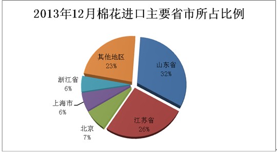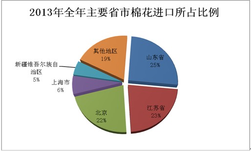 圖5:2013年全年主要省市棉花進口所占比例 轉(zhuǎn)載本網(wǎng)專稿請注明:"本文轉(zhuǎn)自錦橋紡織網(wǎng)",更多紡織專業(yè)資訊,關(guān)注錦橋紡織網(wǎng)微信公眾號。微信搜:錦橋紡織網(wǎng) |
