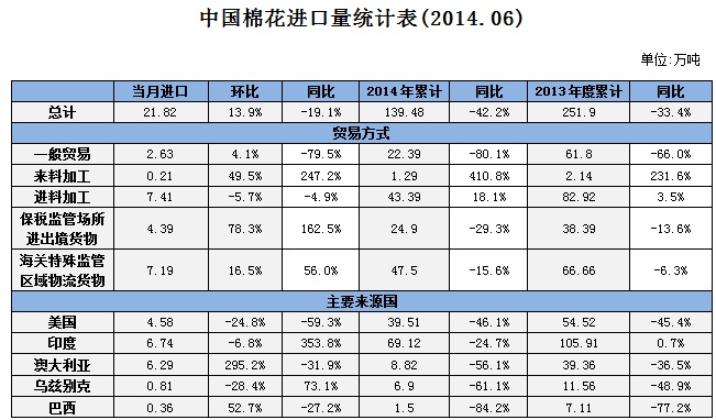據(jù)海關(guān)統(tǒng)計(jì),2014年6月我國(guó)進(jìn)口棉花21.82萬(wàn)噸,較上月增加2.67萬(wàn)噸,增幅13.9%,同比減少19.1%;平均進(jìn)口價(jià)格2132美元/噸,較5月下跌5美元,跌幅0.2%,同比下跌1.3%。2013年度前10個(gè)月累計(jì)進(jìn)口251.9萬(wàn)噸,同比減少33.4%。2014年前6個(gè)月共進(jìn)口139.48萬(wàn)噸,同比下降42.2%。