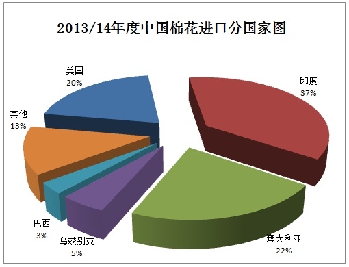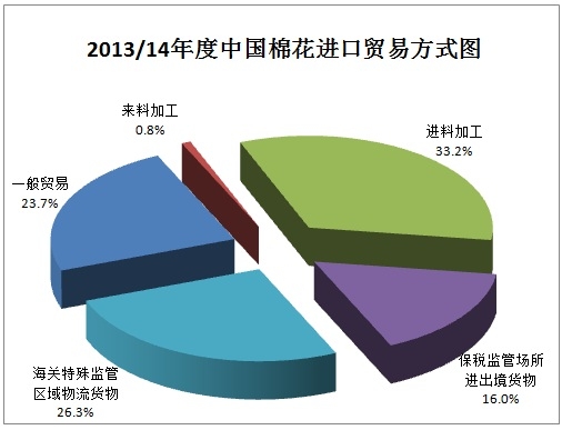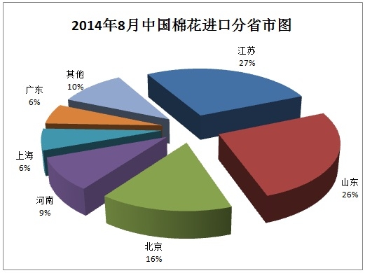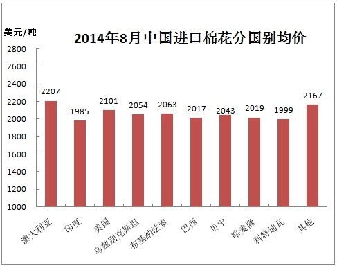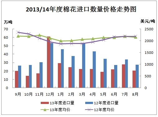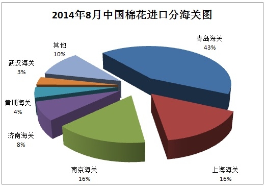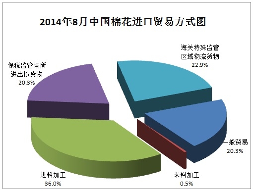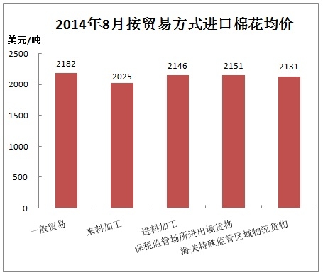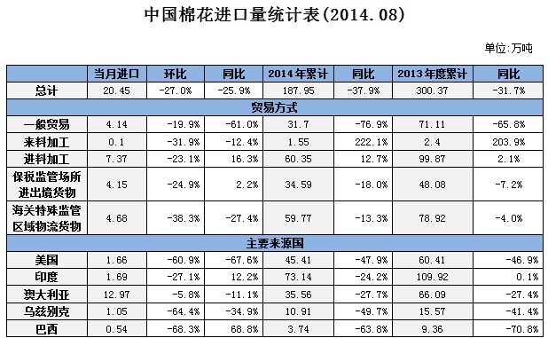 2013/14年度,全球經(jīng)濟表現(xiàn)依然乏力,國內(nèi)紡織增速下滑,棉花進口需求下降,共進口300萬噸,較前一年度減少31.7%。由于內(nèi)外棉價格有所縮小,配額外全關(guān)稅進口量大幅回落,只有30萬噸,占上一年度的36%;進口貿(mào)易方式以進料加工為主;印度繼續(xù)為第一大進口來源國,澳大利亞超過美國居次席,美國退至第三。 8月,我國棉花進口數(shù)量同比環(huán)比均大幅回落,平均價格略有下降。配額使用以1%關(guān)稅居多,比例約占半數(shù);貿(mào)易方式中進料加工為最主要的進口方式,除了來料加工比例較小外,其他三種相差不大,均占兩成左右;來源國中澳大利亞棉遠遠高于其他國家,比例超過六成;進口海關(guān)以青島、上海和南京為主;進口地區(qū)中山東和江蘇最多。 據(jù)海關(guān)統(tǒng)計,2014年8月我國進口棉花20.45萬噸,較上月減少7.59萬噸,減幅27%,同比減少26%;平均進口價格2150美元/噸,較7月下跌33美元,跌幅1.9%,同比下跌1.5%。2013年度累計進口300.4萬噸,同比減少31.7%。2014年前8個月共進口188萬噸,同比下降37.9%。