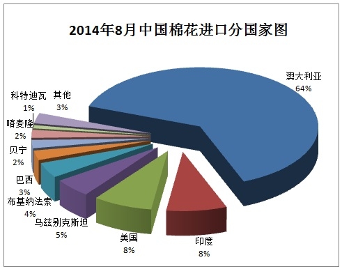 8月份,從主要來源國進口數(shù)量均下降,但澳大利亞棉份額增至過六成,居于首位。