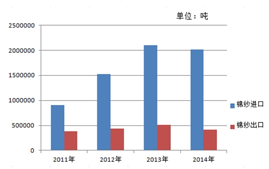 2011-2014年我國棉紗進出口數(shù)量統(tǒng)計圖