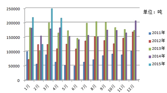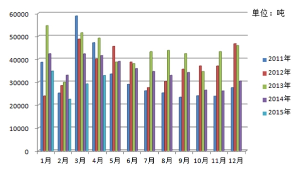 圖12011-2015年我國棉紗進口量分月統(tǒng)計