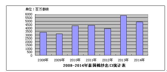 近幾年,泰國(guó)棉紗出口不斷擴(kuò)大。據(jù)泰國(guó)官方統(tǒng)計(jì),2008年至2014年泰國(guó)棉紗出口額從33.64億泰銖增長(zhǎng)至48.85億泰銖,同比增長(zhǎng)31%。其中,2013年泰國(guó)棉紗出口額達(dá)到57.98億泰銖的歷史高點(diǎn)。除了中國(guó)以外,日本、中國(guó)香港和韓國(guó)等都是泰國(guó)棉紗出口最主要的目的國(guó)家,目前泰國(guó)棉紗對(duì)上述幾個(gè)國(guó)家的出口均處于增長(zhǎng)態(tài)勢(shì)。