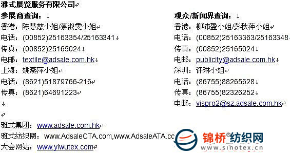 更多展會詳情,請瀏覽展會網(wǎng)站:www.yiwutex.com或與雅式展覽服務(wù)有限公司聯(lián)系。