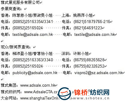 新聞稿 ShanghaiTex 2011——強(qiáng)勁內(nèi)需吸引國(guó)際紡機(jī)制造商 「第十五屆上海國(guó)際紡織工業(yè)展」(簡(jiǎn)稱:「ShanghaiTex 2011」)將于2011年6月14-17日在上海浦東新國(guó)際博覽中心舉辦,作為中國(guó)歷史最悠久的紡織工業(yè)展自有民族品牌,該展會(huì)歷來(lái)有著行業(yè)“晴雨表”之稱,是業(yè)界第一時(shí)間了解市場(chǎng)資訊、發(fā)掘新技術(shù)的最佳渠道,也是國(guó)內(nèi)外紡織生產(chǎn)企業(yè)的首選采購(gòu)平臺(tái),更是企業(yè)市場(chǎng)推廣和宣傳的1個(gè)最重要舞臺(tái)。 據(jù)展會(huì)主辦方表示,本屆展會(huì)招展形勢(shì)喜人,除吸引眾多海內(nèi)外知名企業(yè)參展外,德國(guó)和韓國(guó)將繼續(xù)以展團(tuán)形式亮相,屆時(shí),來(lái)自德國(guó)和韓國(guó)知名機(jī)械設(shè)備企業(yè)將集體亮相,必將成為本屆展會(huì)不容錯(cuò)過(guò)的一大精彩看點(diǎn)。 德國(guó)企業(yè)看好中國(guó)強(qiáng)勁內(nèi)需市場(chǎng) 在經(jīng)受全球金融風(fēng)暴的洗禮和淬煉之后,2010年全球經(jīng)濟(jì)開(kāi)始逐步回暖,中國(guó)紡織行業(yè)復(fù)蘇的腳步更是震驚全球。據(jù)國(guó)家統(tǒng)計(jì)局發(fā)布的數(shù)據(jù),2010年1-8月中國(guó)紡織機(jī)械進(jìn)出口總額37.26億美元,同比增長(zhǎng)56.84%;其中進(jìn)口26.42億美元,同比增長(zhǎng)63.13%,增幅比上年同期提高108.08個(gè)百分點(diǎn)。由此可見(jiàn),中國(guó)的紡織企業(yè)正在飛速成長(zhǎng)。毋庸置疑,中國(guó)已經(jīng)成為海外企業(yè)最看重的市場(chǎng)之一,而上海作為中國(guó)的經(jīng)濟(jì)商貿(mào)中心,更成為各方矚目之焦點(diǎn)。 在國(guó)內(nèi)強(qiáng)勁內(nèi)需市場(chǎng)需求下,作為此期間(2010年1-8月)紡織機(jī)械進(jìn)口排第二位、以機(jī)器產(chǎn)品耐用著名的德國(guó)來(lái)說(shuō),是進(jìn)一步擴(kuò)大市場(chǎng)佔(zhàn)有率的良好時(shí)機(jī)。本次展會(huì)的德國(guó)展團(tuán)將有眾多知名紡織機(jī)械設(shè)備企業(yè)亮相,并加大投放力度,期望能更好的開(kāi)拓中國(guó)市場(chǎng)。參展商包括卡爾·邁耶(KarlMayer)、德樂(lè)(Terrot)、邁耶·西(Mayer&Cie)、萊默爾(ErhardtLeimer)、勞舍爾(Rauschert)、安德里茲寇司德(AndritzKuesters)、Bobotex、奧斯多夫(Osthoff-Senge)、SedoTreepoint、羅森克(Rosink)、布魯克納(Brueckner)等將展示行業(yè)領(lǐng)先的經(jīng)編機(jī)、針織機(jī)、紡紗機(jī)、染色及后整理機(jī)等熱門(mén)機(jī)械。 卡爾·邁耶,是德國(guó)展區(qū)的主要參展商之一,對(duì)「ShanghaiTex 2011」十分重視,將擴(kuò)大展出面積于W1館(針織及織襪機(jī)械專區(qū))和W3館(織造機(jī)械專區(qū))分設(shè)展位,以滿足不同層次的企業(yè)需要。卡爾·邁耶成立于1937年,現(xiàn)在已經(jīng)發(fā)展成為世界經(jīng)編機(jī)市場(chǎng)領(lǐng)先者,其特里科經(jīng)編機(jī)和拉舍爾經(jīng)編機(jī)采用各種理念和專門(mén)的解決方案,滿足企業(yè)日益增長(zhǎng)的需求,是業(yè)界人士不能錯(cuò)過(guò)參觀的展位之一。 韓國(guó)展區(qū)展示織針技術(shù)最新進(jìn)展 另一方面,韓國(guó),1個(gè)充滿活力的亞洲國(guó)家,將繼續(xù)鼎力支持「ShanghaiTex 2011」。韓國(guó)展團(tuán)由韓國(guó)紡織機(jī)械協(xié)會(huì)牽頭,共組織20多家企業(yè)參與,包括三星制針、DGI、Dongsin、Hyosan、現(xiàn)代商社(HyunDae)、NamSeo等,企業(yè)的主要展出產(chǎn)品是“針織機(jī)械”和“針”。這些企業(yè)旨在借助「ShanghaiTex」這一平臺(tái),展示其先進(jìn)技術(shù)和產(chǎn)品,以開(kāi)拓更廣闊的中國(guó)市場(chǎng)。 韓國(guó)展區(qū)的主要參展商之一——韓國(guó)三星,成立于1948年,公司在韓國(guó)制針行業(yè)起領(lǐng)頭作用,在全世界制針領(lǐng)域里是公認(rèn)的排行第二的品牌,主營(yíng)品牌:島精針、斯托爾針、國(guó)產(chǎn)全電腦橫機(jī)針、選針腳、長(zhǎng)針腳、中間片等,銷售點(diǎn)分布在全球20多個(gè)國(guó)家,客戶在任何1個(gè)地方都可以隨時(shí)隨地購(gòu)買到所需的產(chǎn)品。此次,三星最新和最全面的產(chǎn)品將亮相于「ShanghaiTex 2011」,是韓國(guó)展區(qū)必看的亮點(diǎn)。 「ShanghaiTex 2011」由上海紡織控股(集團(tuán))公司、中國(guó)國(guó)際貿(mào)易促進(jìn)委員會(huì)上海市分會(huì)、中國(guó)國(guó)際商會(huì)上海商會(huì)共同主辦;由上海市國(guó)際展覽有限公司、上海紡織技術(shù)服務(wù)展覽中心、雅式展覽服務(wù)有限公司承辦。 作為中國(guó)歷史最悠久的紡織工業(yè)展,ShanghaiTex自1984首辦以來(lái),每年都在上海舉行。受惠于紡織工業(yè)復(fù)蘇及需求激增,ShanghaiTex 2011預(yù)計(jì)展出面積超過(guò)92000平方米和1000家參展商。觀眾網(wǎng)上預(yù)先登記現(xiàn)在已經(jīng)展開(kāi)。請(qǐng)即瀏覽大會(huì)指定信息網(wǎng)www.shanghaitexonline.com并實(shí)時(shí)登記以收取最新展會(huì)訊息。