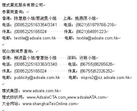 本屆展會(huì)觀眾網(wǎng)上預(yù)先登記現(xiàn)正火熱進(jìn)行中。請(qǐng)即瀏覽大會(huì)指定信息網(wǎng)www.shanghaitexonline.com并即時(shí)登記以收取最新展會(huì)訊息。