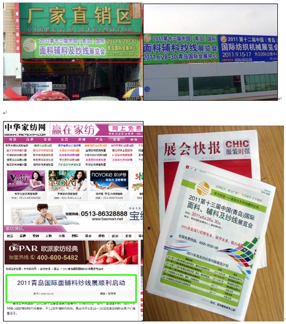 為保證展會效果,本次展會推廣可謂是苦下功夫,除了數(shù)百家專業(yè)網(wǎng)絡(luò)、報紙、雜志等媒介宣傳推廣渠道外,還增設(shè)了集群地戶外巨幅廣告牌、墻體廣告、橫幅廣告等方式來宣傳推廣展會。在展會開幕期間,組委會還在展會現(xiàn)場設(shè)置了新聞中心,現(xiàn)場采集文字、圖片信息,并在第一時間編輯成新聞、短信,并通過網(wǎng)絡(luò)傳送給各大媒體,使全國各相關(guān)媒體在第一時間得到展會的最新動態(tài)。中國新聞網(wǎng)、青島電視臺、青島日報、齊魯晚報、半島網(wǎng)、半島都市報、中國紡織報、《紡織服裝周刊》、世界服裝鞋帽網(wǎng)等專業(yè)、大眾媒體到會采訪報道,給予了展會強(qiáng)有力的輿論支持。中華紡織網(wǎng),中國紡織網(wǎng),世界服裝鞋帽網(wǎng),《服飾商情》,《服飾資源》,中國綢都網(wǎng),中國服裝網(wǎng),中國品牌服裝網(wǎng),中國流行色協(xié)會,全球紡織網(wǎng),中華家紡網(wǎng),服裝輔面料網(wǎng),錦橋紡織網(wǎng),365紡織網(wǎng),服裝面料輔料等知名行業(yè)專業(yè)媒體從展會啟動到展會勝利閉幕也給予了展會極大的關(guān)注和報道支持。