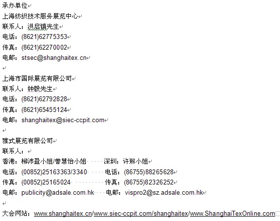 第十六屆上海國際紡織工業(yè)展將于2013年6月再度于上海新國際博覽中心舉行,如欲查詢展會詳情,歡迎聯(lián)絡(luò)承辦單位,或登入大會網(wǎng)站:www.shanghaitex.cn/www.siec-ccpit.com/shanghaitex/www.ShanghaiTexOnline.com。
