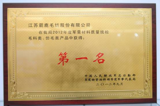 2012年9月,箭鹿毛紡在總后軍品質量統(tǒng)檢中榮獲毛紡、仿毛兩項第一。