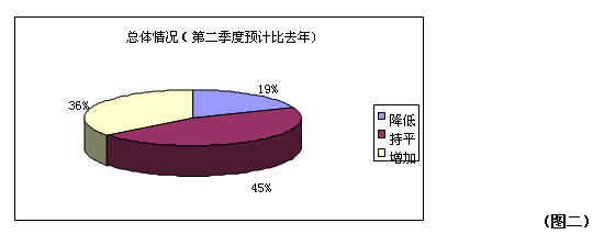 第一個(gè)問題是關(guān)于企業(yè)總體經(jīng)營狀況的調(diào)查。從圖一可以明顯的看出2013年一季度實(shí)際銷售情況與去年同期相比,46%的企業(yè)表示總體情況是持平的,20%的企業(yè)表示他們的銷售額相比同期有所降低,只有34%的企業(yè)的營業(yè)額增加了。同時(shí)在即將到來的二季度,如圖二所示45%的企業(yè)認(rèn)為他們的銷售額不會(huì)有改變,19%的企業(yè)認(rèn)為銷售額會(huì)降低。受訪企業(yè)對于2013年全年的銷售預(yù)期信心明顯增強(qiáng),34%的企業(yè)認(rèn)為他們的銷售額相比2012年是會(huì)增加的,但是也有38%的企業(yè)認(rèn)為13年的企業(yè)經(jīng)營情況會(huì)比12年差。